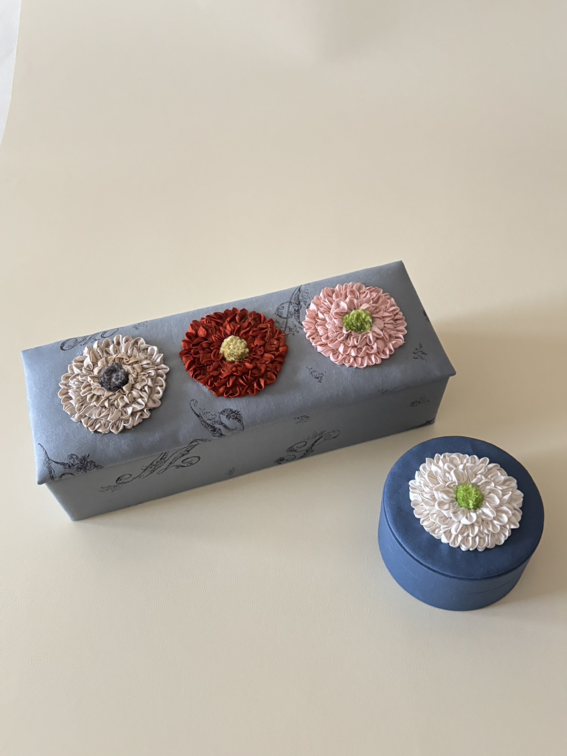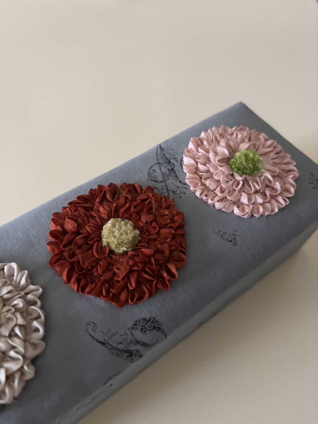 1回目 4/3(金) 講師:小関鈴子 希少な紅絹でルーシングフラワーを作り、箱の上部を制作します。